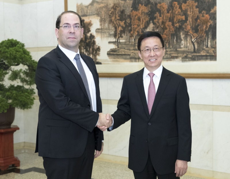9月5日,中共中央政治局常委、国务院副总理韩正在北京钓鱼台国宾馆会见突尼斯总理沙赫德。新华社记者 王晔 摄