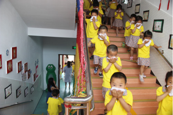 伴随一阵急促的火灾警报声响起,岳阳县中心幼儿园消防疏散演练拉开帷幕。现场模拟二楼教室发生火灾,烟雾弥漫开来。在班级老师的指引下,各班幼儿井然有序、一带一、沿着疏散楼梯有秩序地从教学楼的各个楼层迅速撤离至“安全地带”,用时2分半。