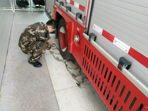 车辆器材检查维护保养工作中,大队采取防寒、防冻、防滑等措施,给执勤车辆更换机油、添加防冻液、加装防滑链,严格实行早晚两次发车预热制度;并及时配齐配足防寒服装及防滑防冻、破冰除雪物资装备,储备充足的灭火药剂和救援物资,充分准备抢险救援用的车辆、器材装备、衣食供应、医药等方面的物资。并制定完善的应急救援预案,严格落实灭火救援和抢险救灾现场的安全防护工作,落实官兵个人防护装备,防止官兵冻伤、摔伤等事故的发生。