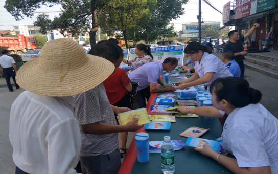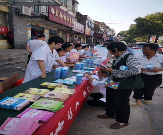 卫生院工作人员李勤龙、龚世雄向群众发放健康手册和印有禁毒宣传标语的水杯。