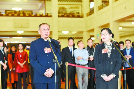 3月3日下午,北京人民大会堂,住湘全国政协委员潘碧灵(左)亮相全国政协十三届二次会议首场“委员通道”,回答了中外记者提问。 记者 田超 摄