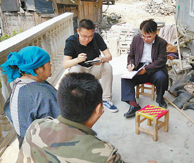 广西分社记者庞革平(右一)、刘佳华(右二)在广西壮族自治区隆林各族自治县克长乡大庆村龙科响屯上寨,采访贫困户黄阿册等。