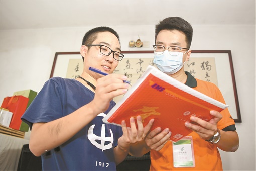 8月14日15时30分,长沙市科大佳园南苑,安博施同学(左)签收来自北京大学的录取通知书。 记者 傅聪 摄