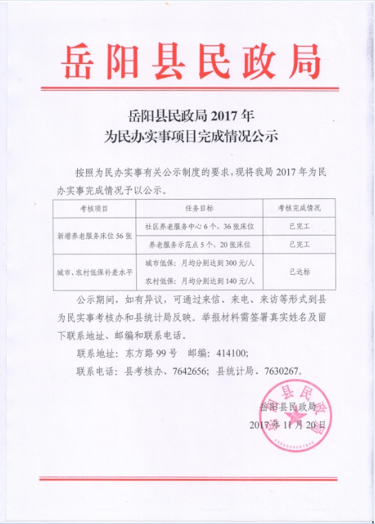 岳阳县民政局2017年为民办实事项目完成情况公示