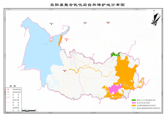 为认真落实《国家林业和草原局办公室 自然资源部办公厅 生态环境部办公厅关于报送自然保护地整合优化方案的函》(办函保字〔2023〕33 号和《省林业局、省自然资源厅、省生态环境厅关于报送自然保护地整合优化方案的函(湘林保〔2023〕5号)》等文件精神,岳阳县自然保护地整合优化后岳阳县宝塔湖县级自然保护区并入湖南东洞庭湖国家级自然保护区,岳阳楼洞庭湖国家级风景名胜区铁山景区与大云山国家森林公园重叠区域合并至大云山国家森林公园,将湖南新墙河国家湿地公园合归并至岳阳楼洞庭湖国家级风景名胜区铁山景区,保留张谷英省级风景名胜区。