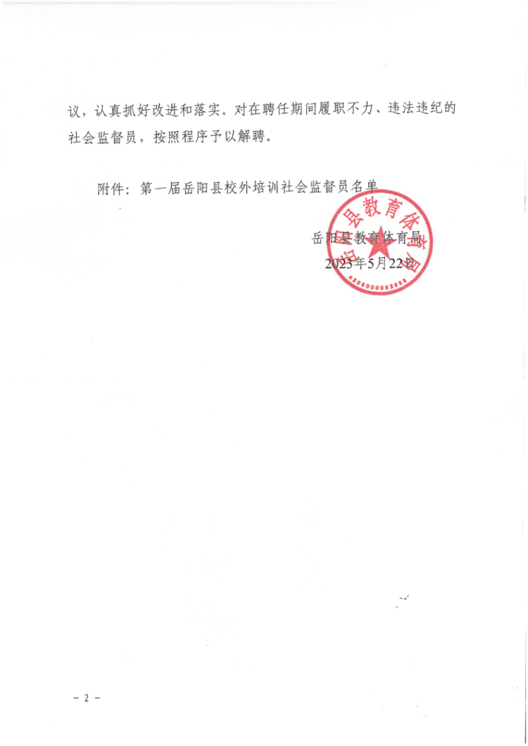 岳阳县教育体育局关于公布第一届岳阳县校外培训社会监督员名单的通知