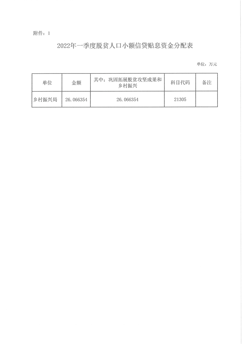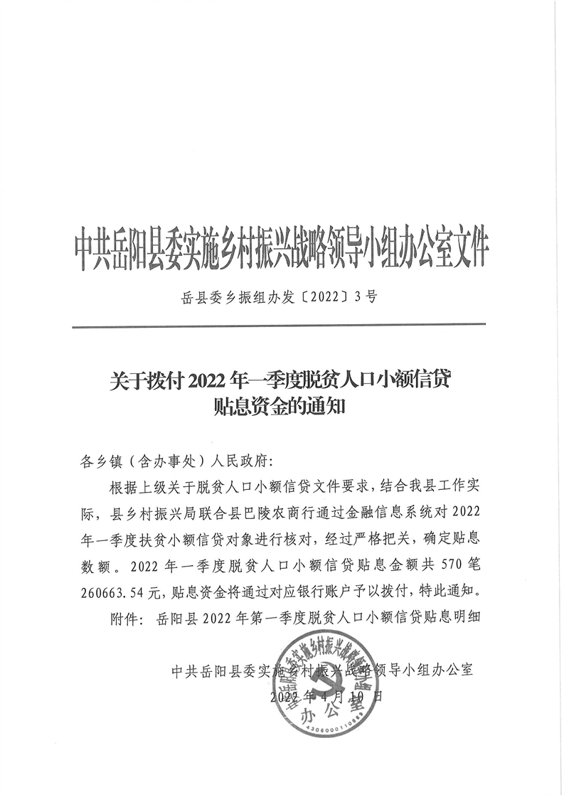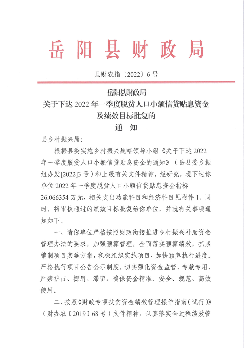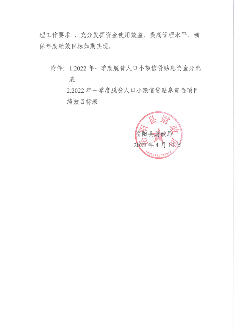 岳阳县财政局下达2022年一季度脱贫人口小额信贷贴息资金及绩效目标批复的公开公示