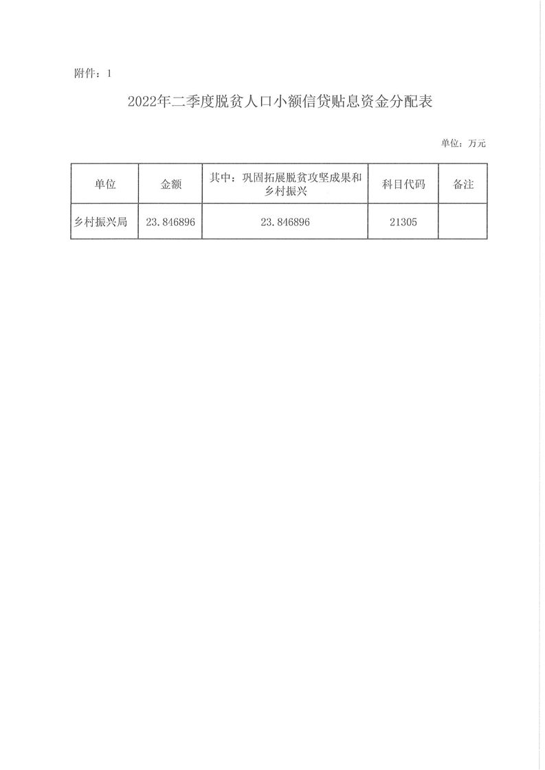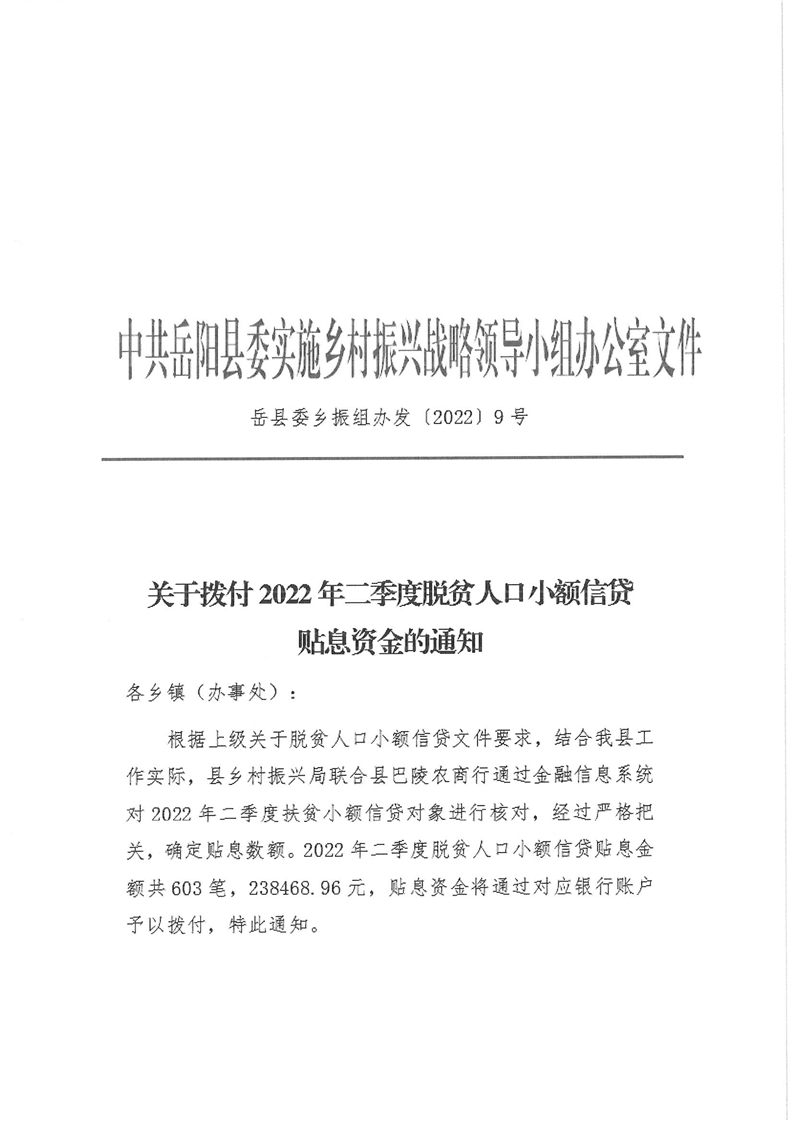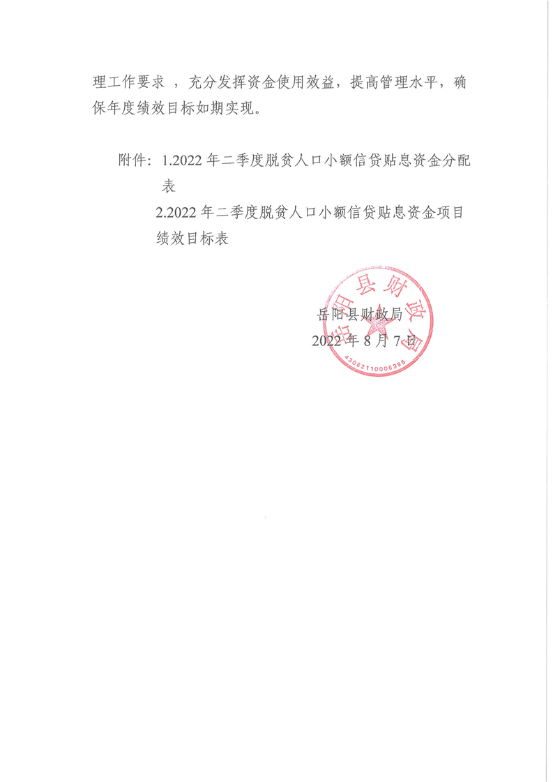 岳阳县财政局下达2022年二季度脱贫人口小额信贷贴息资金及绩效目标批复的公开公示