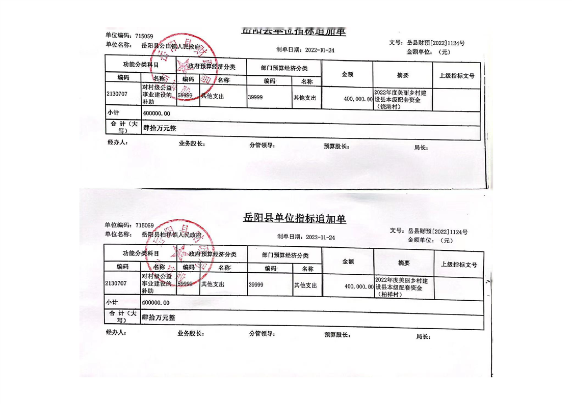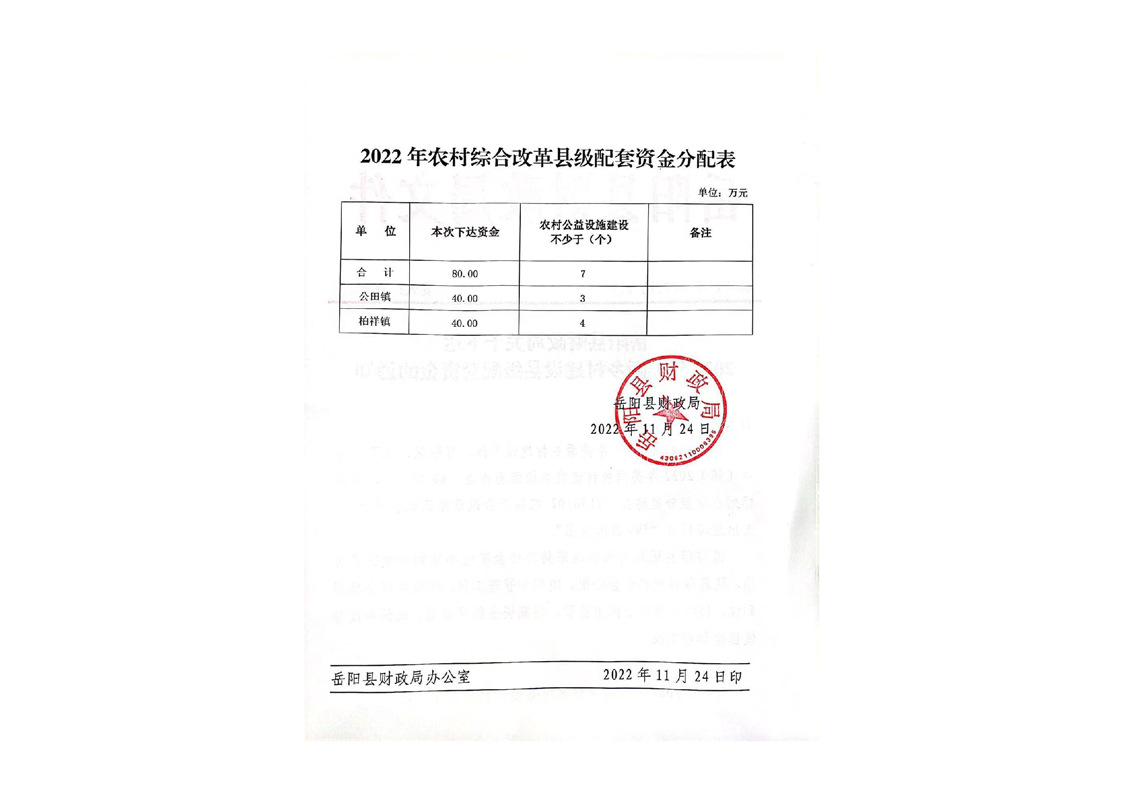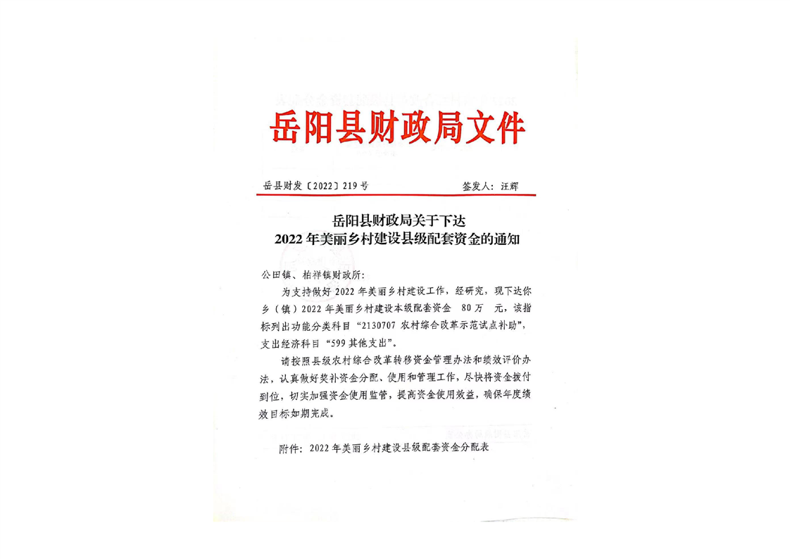 岳阳县财政局关于下达2022年美丽乡村建设县级配套资金的通知(岳县财发〔2022〕219号)及资金拨付单