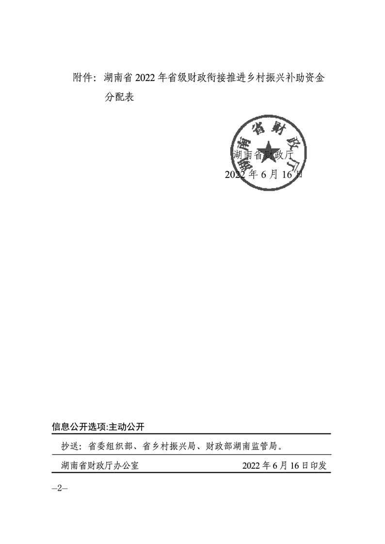 湖南省财政厅关于下达2022年省级财政衔接推进乡村振兴补助资金的通知(湘财预〔2022〕102号)