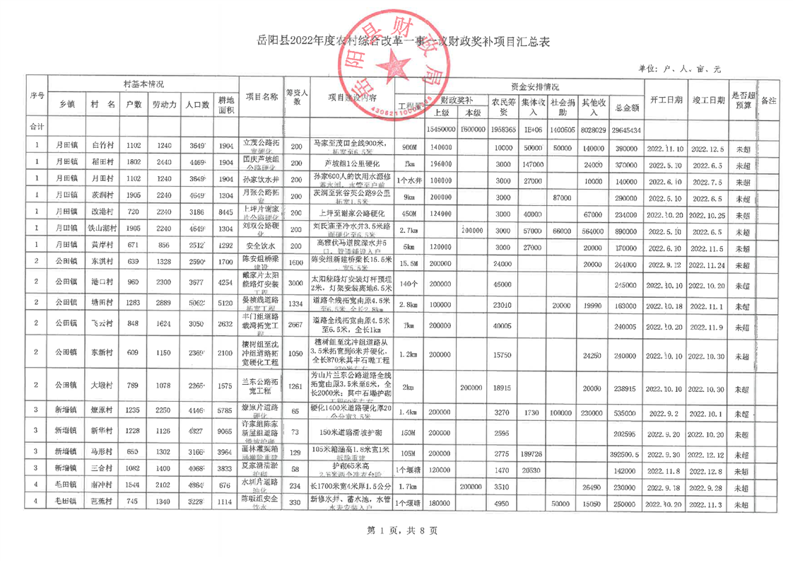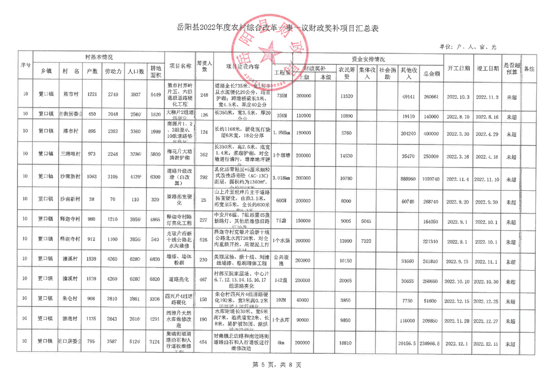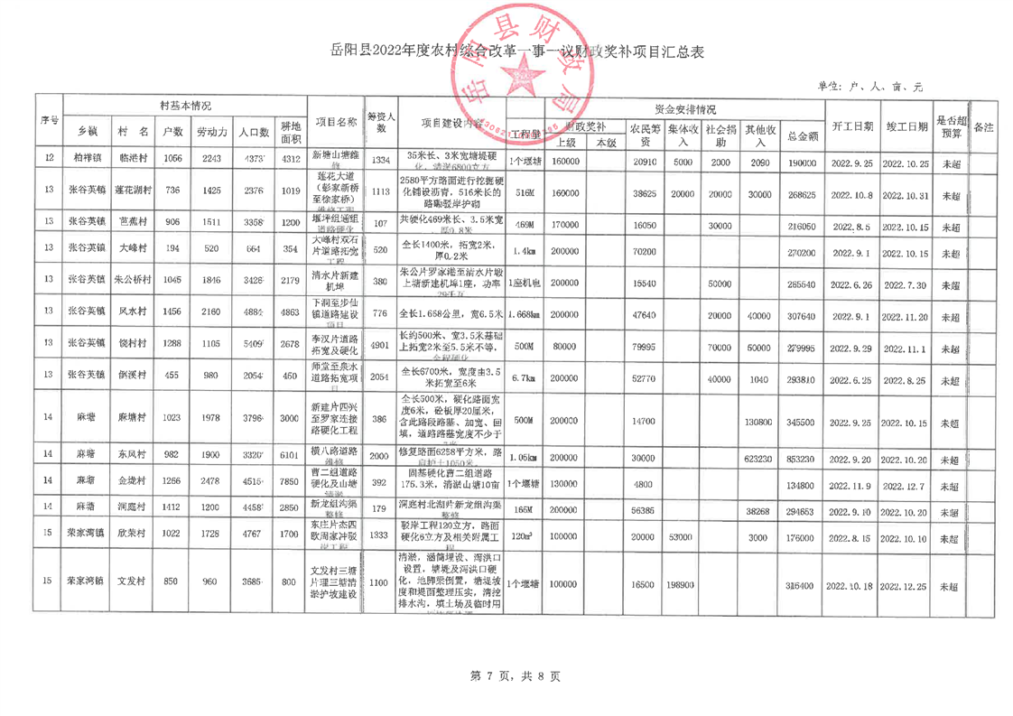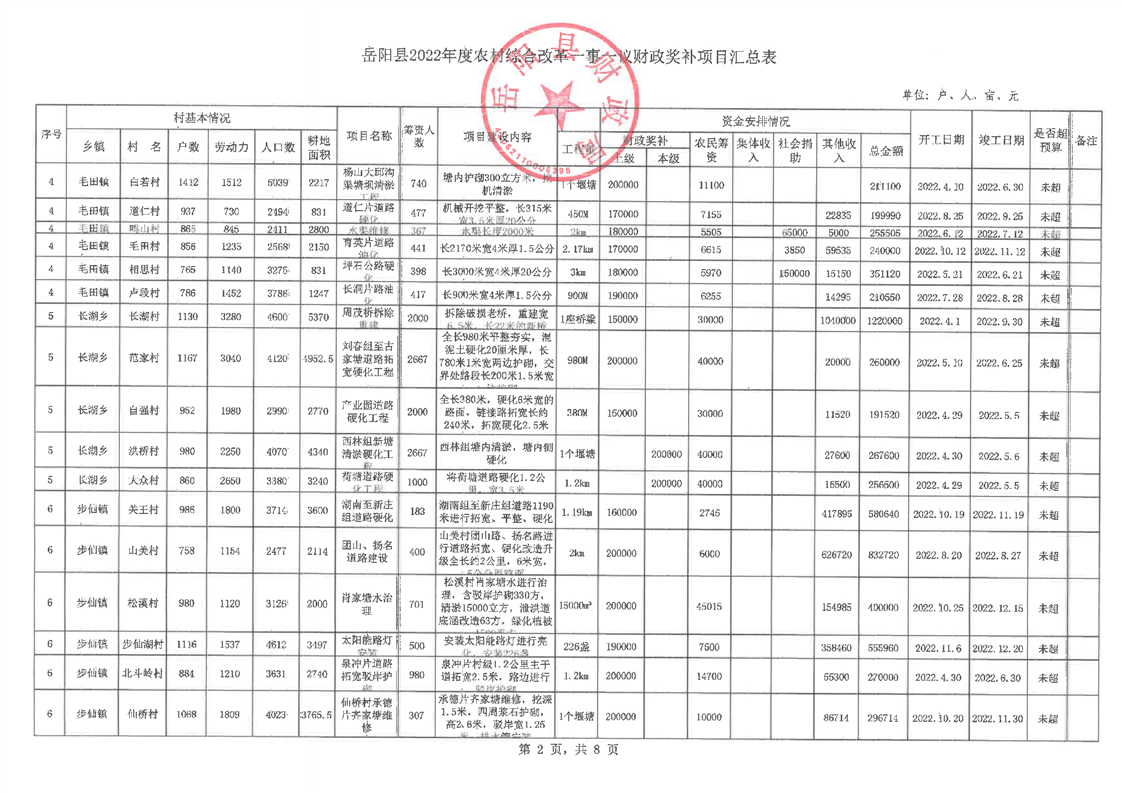 岳阳县2022年度农村综合改革一事一议财政奖补项目汇总表12月30日