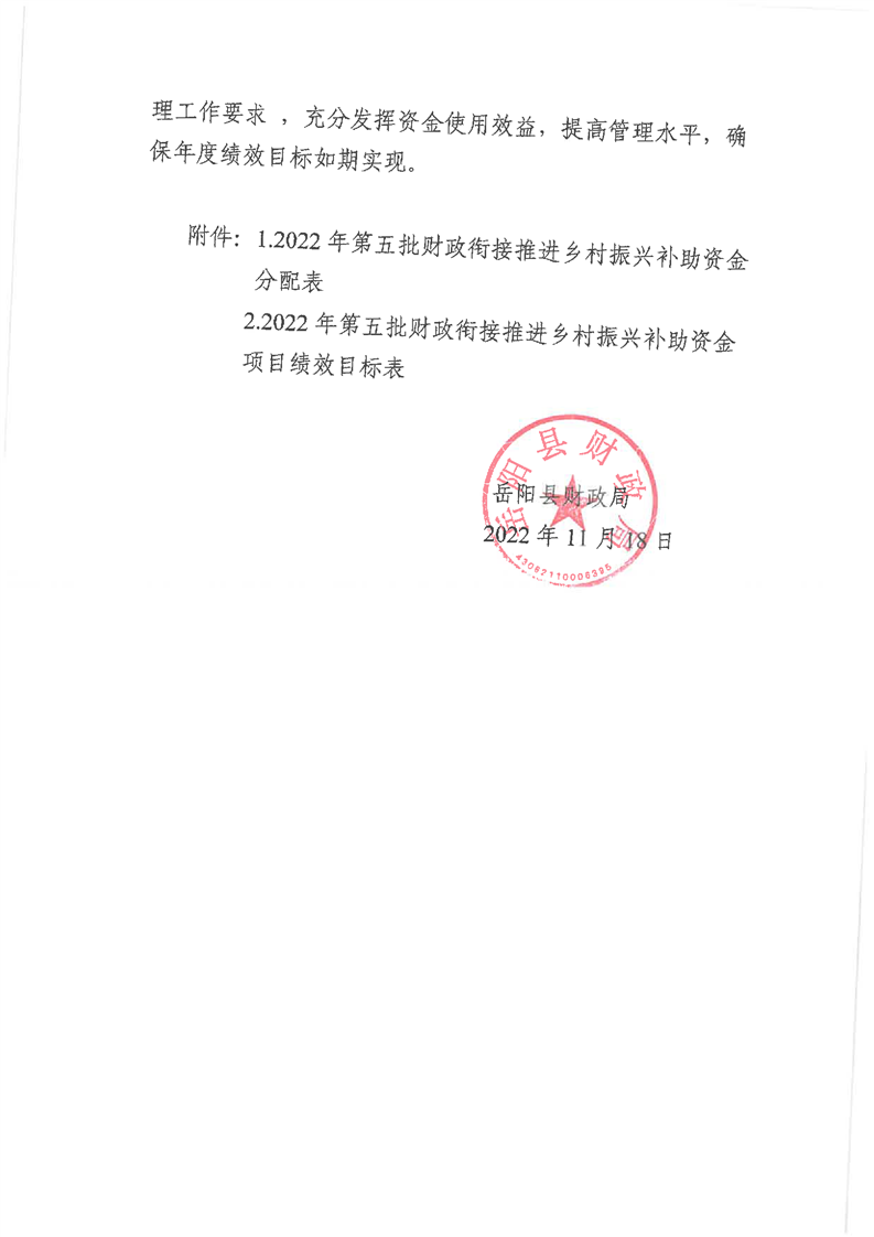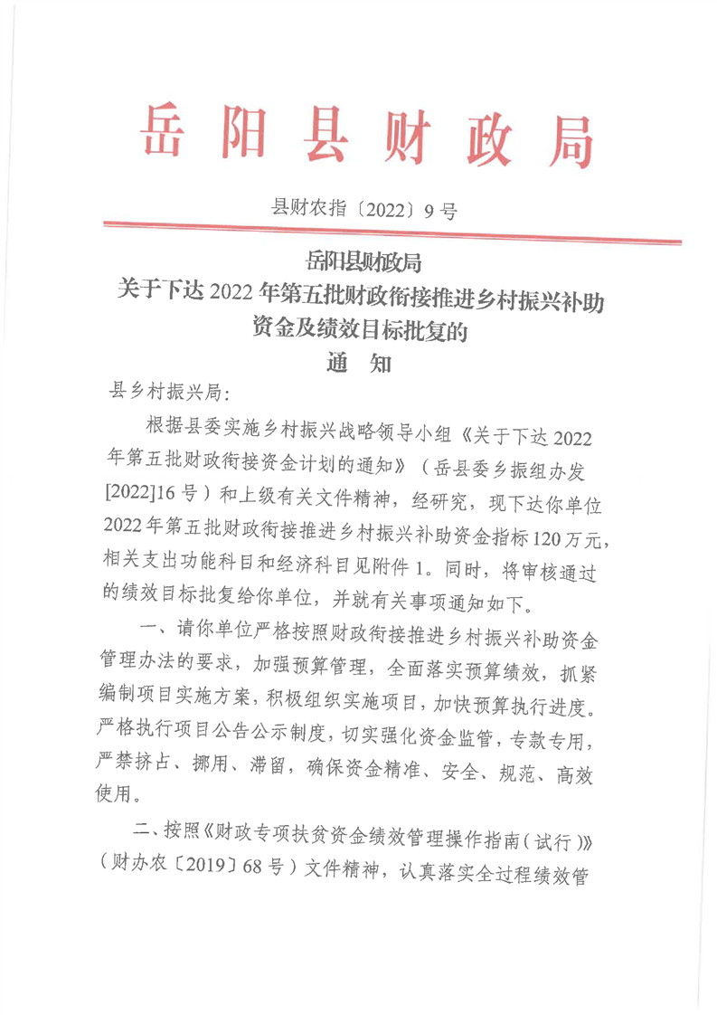岳阳县财政局下达2022年第五批财政衔接推进乡村振兴补助资金及绩效目标批复公开公示