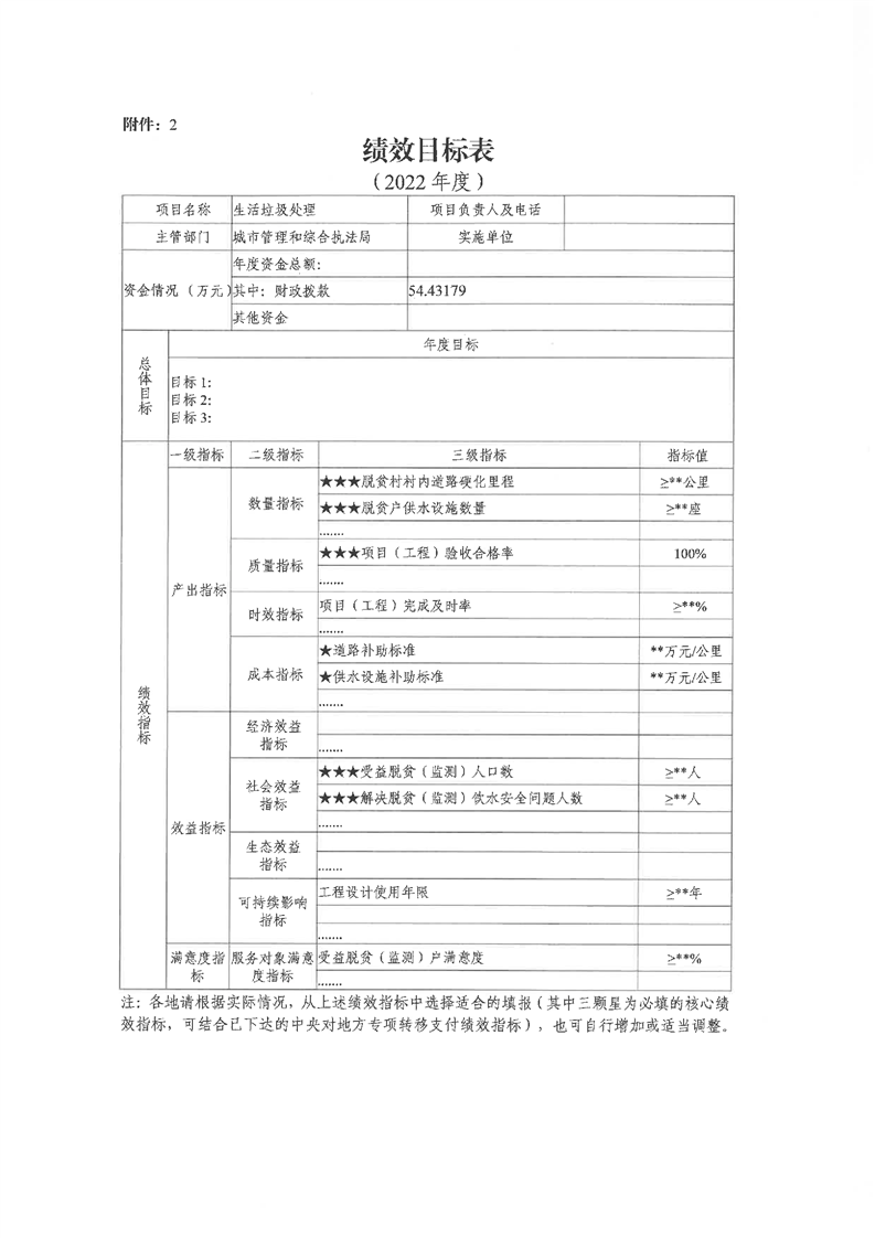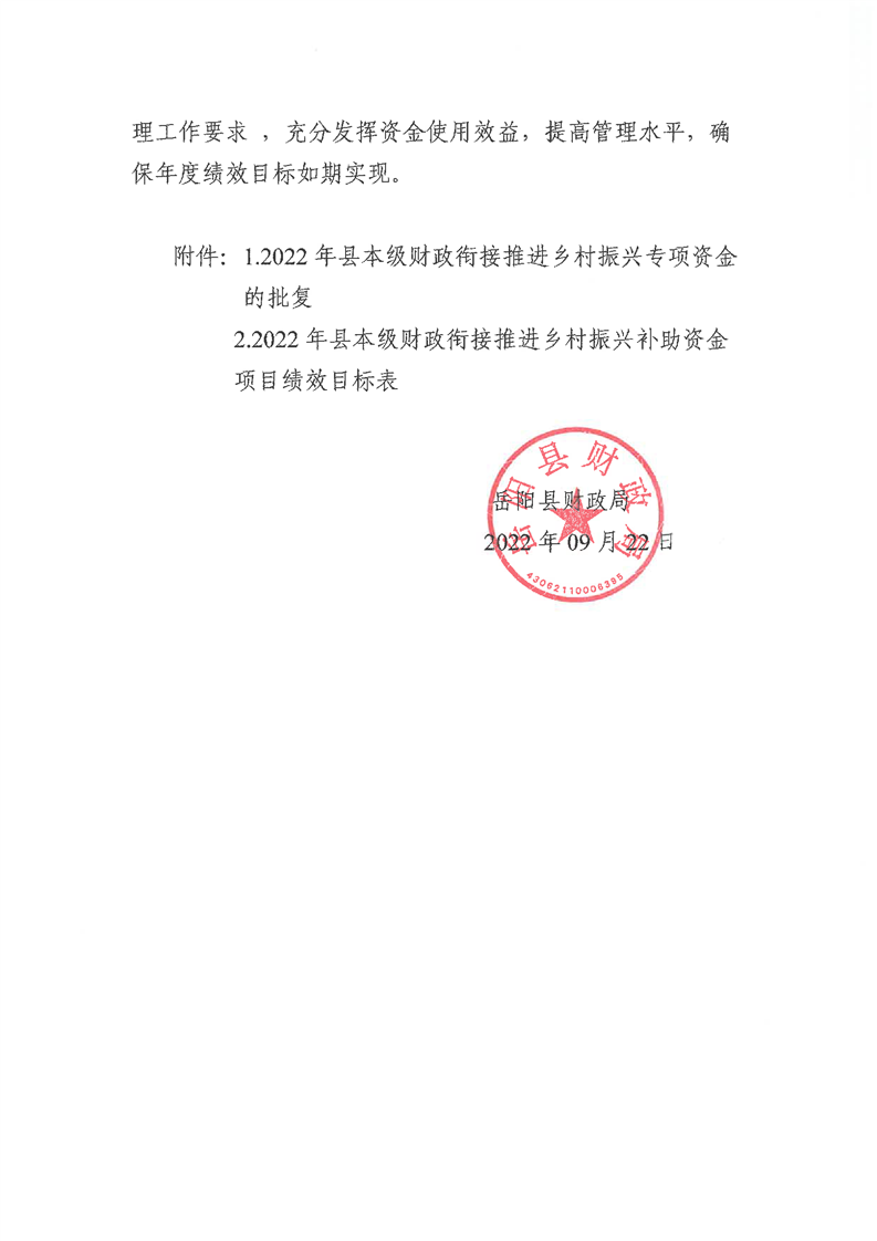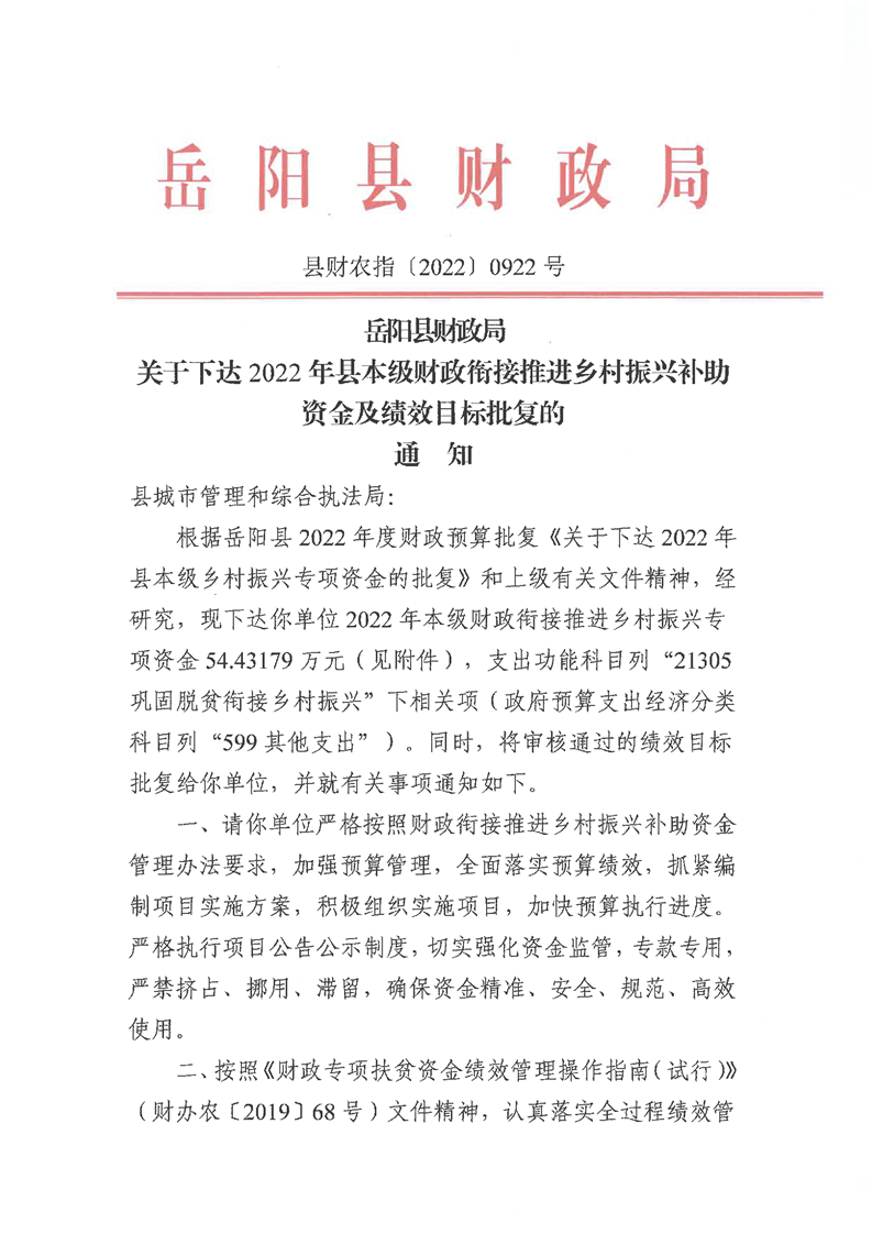岳阳县财政局关于下达2022年县本级财政衔接推进乡村振兴补助资金及绩效目标批复(城管局54.43万)公开公示
