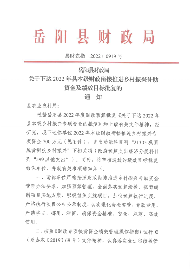 岳阳县财政局关于下达2022年县本级财政衔接推进乡村振兴补助资金及绩效目标批复(农业局700)公开公示