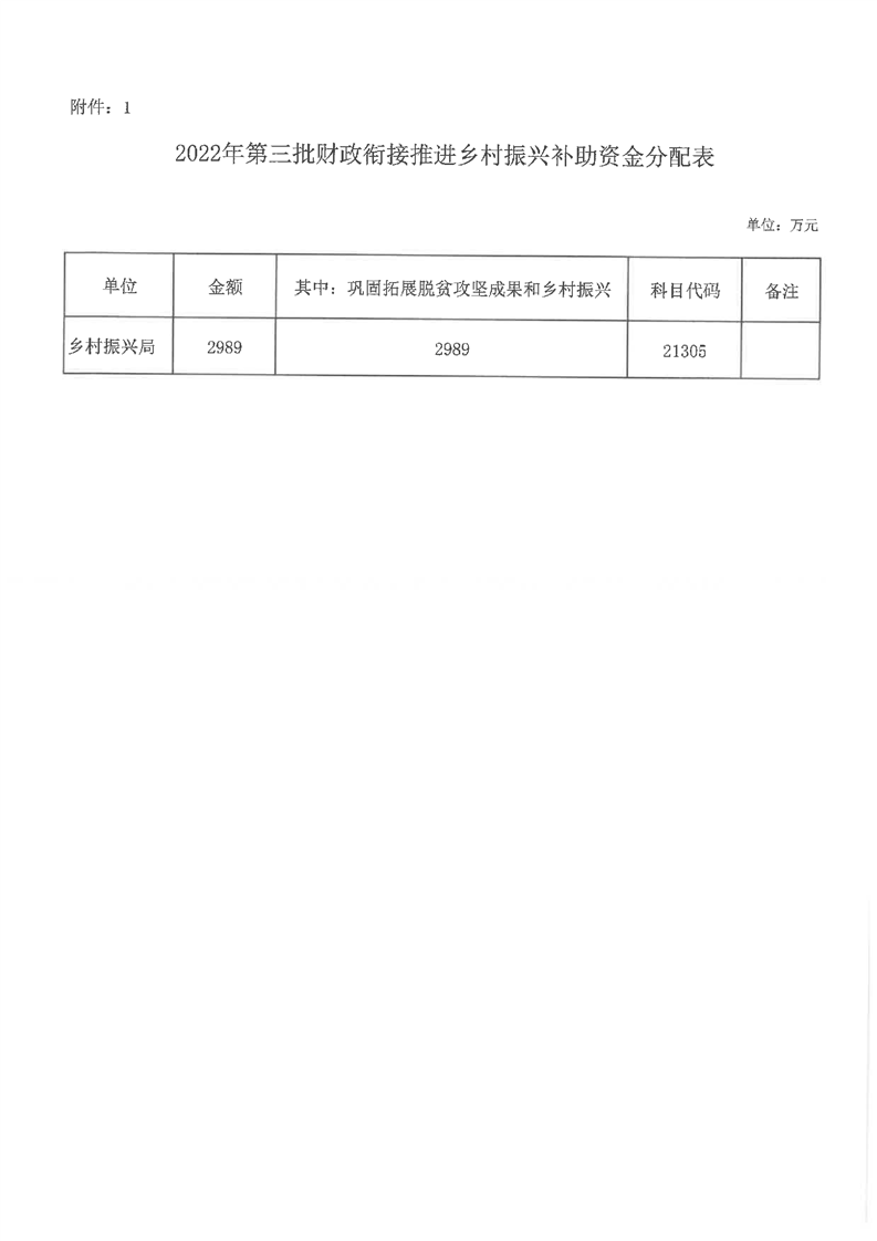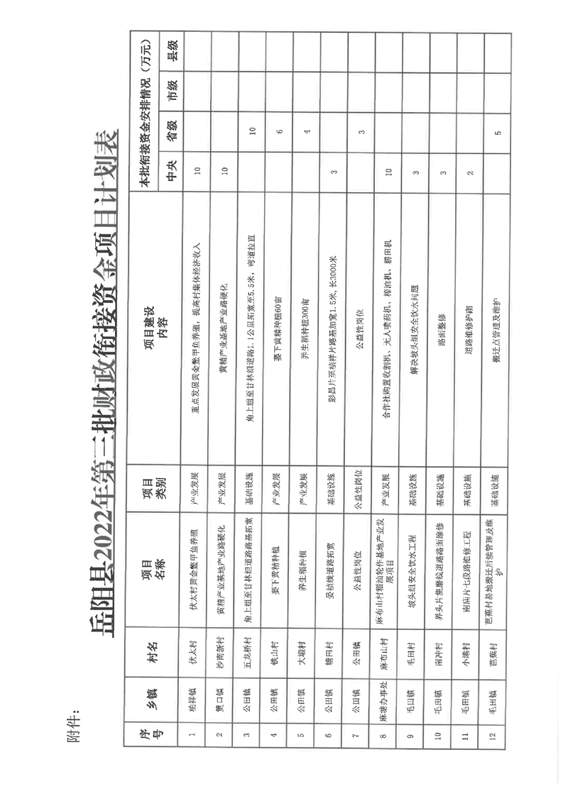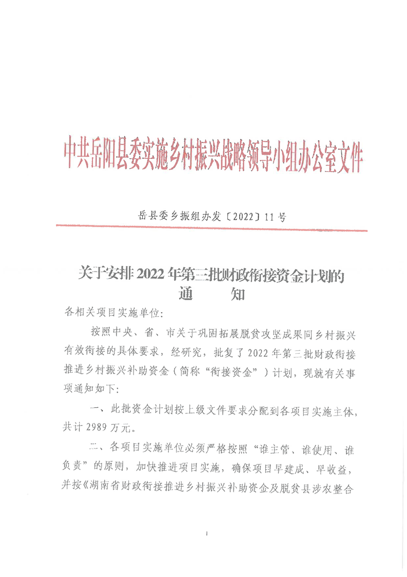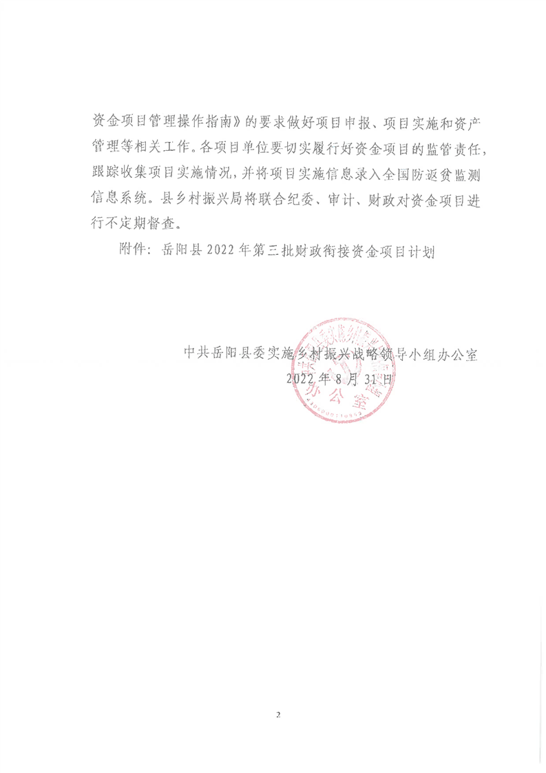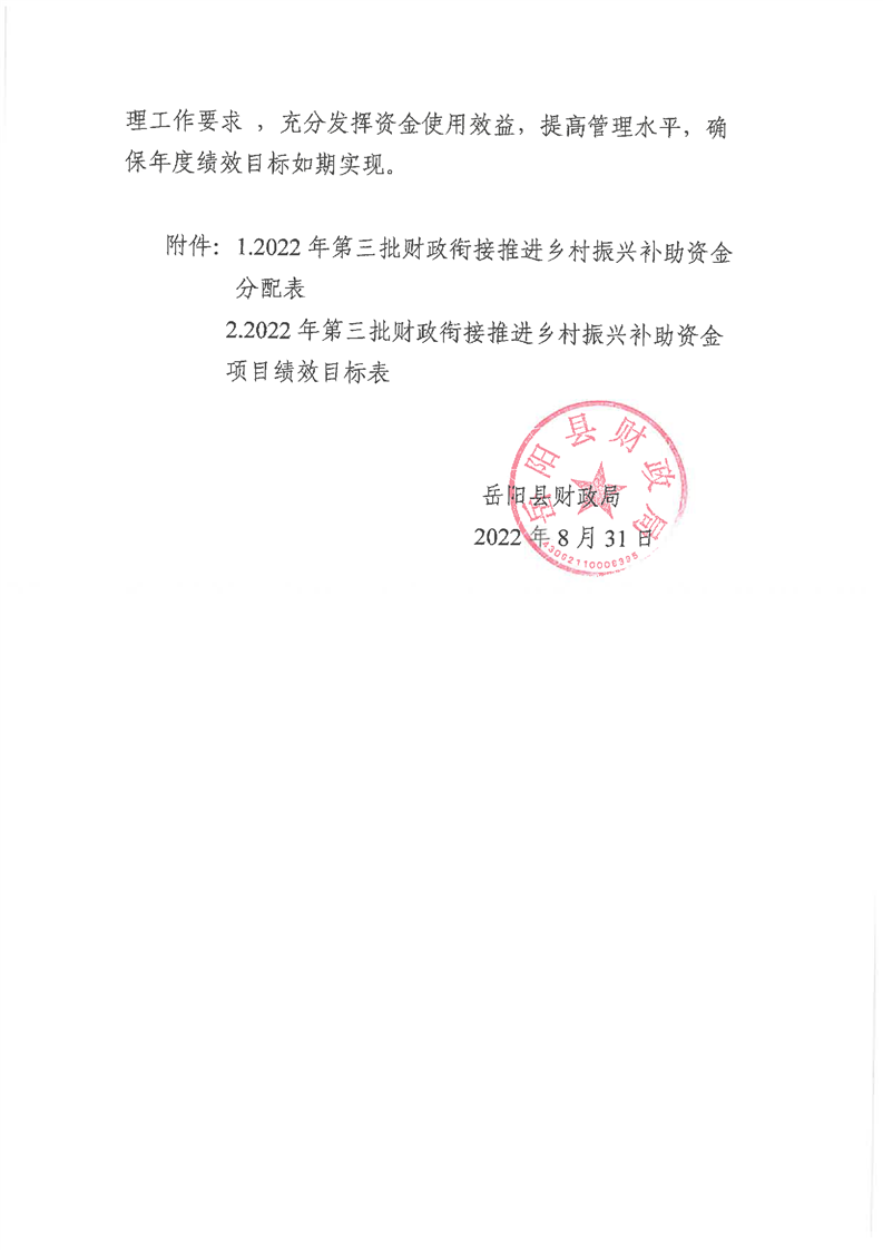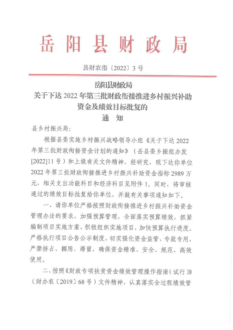 岳阳县财政局2022年关于下达第三批财政衔接推进乡村振兴资金及绩效目标批复公开公示