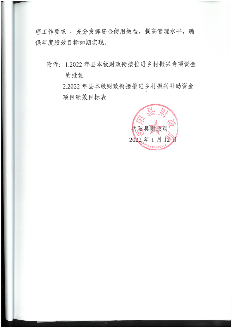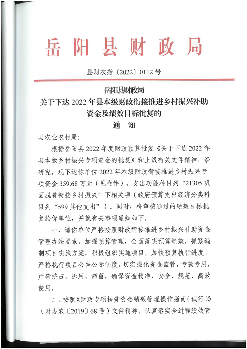 岳阳县财政局关于下达2022年县本级财政衔接推进乡村振兴补助资金及绩效目标批复(农业局359.68)公开公示