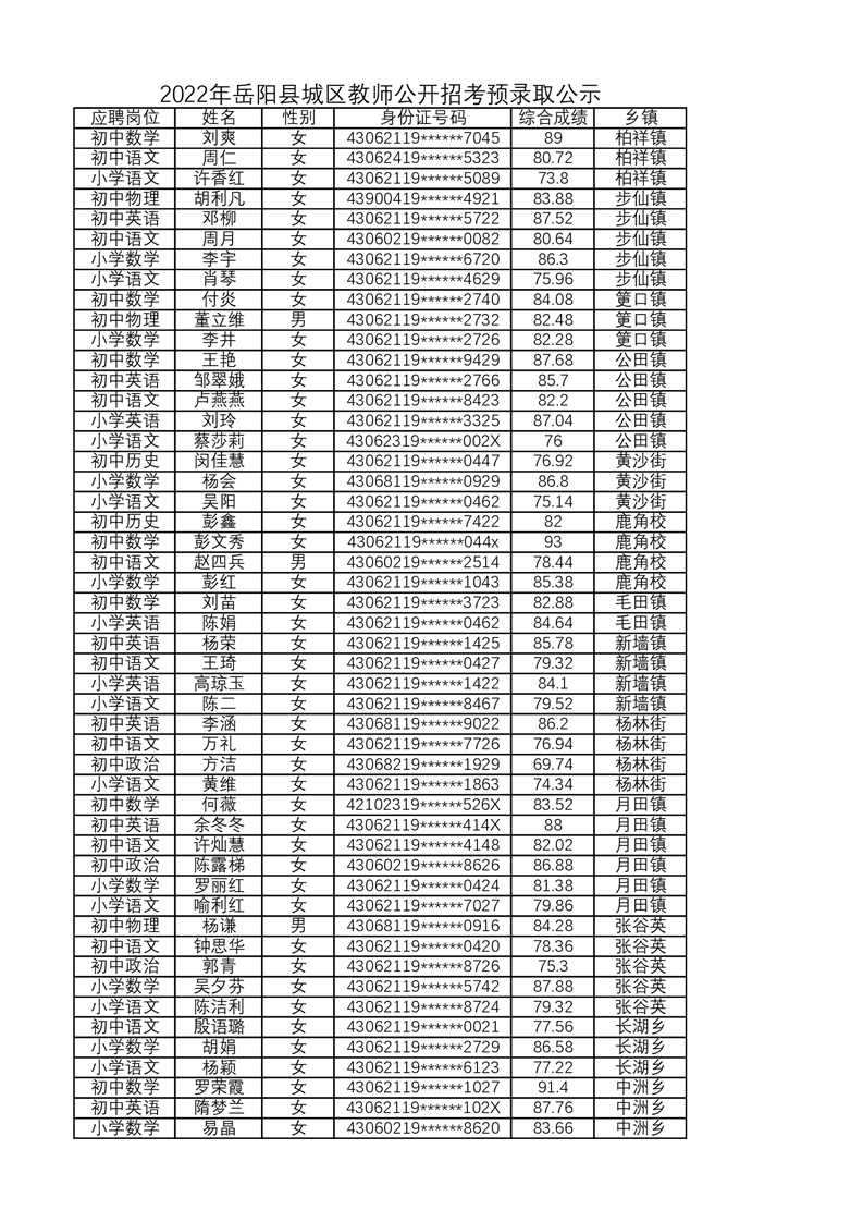 2022年岳阳县城区教师公开招考预录公示