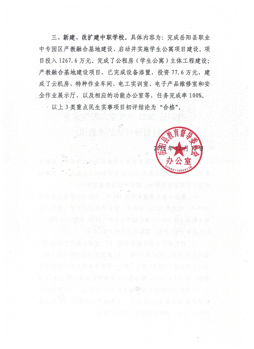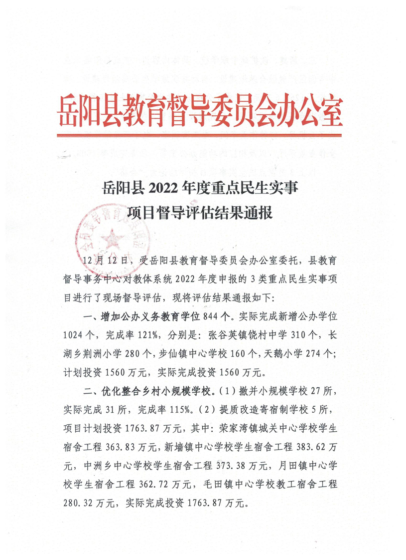 岳阳县教体系统2022年度重点民生实事项目督导评估结果通报