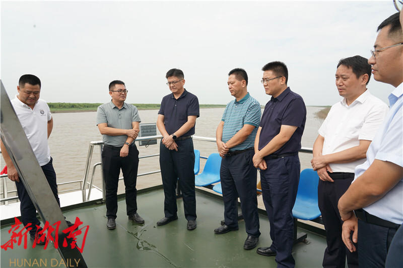 罗毅君一行从鹿角码头乘船前往东洞庭湖进行现场察看,详细了解可采区开采前期准备、河道采砂管理、基础设施建设规划等情况,并实地察看了打击非法采砂视频监控系统。