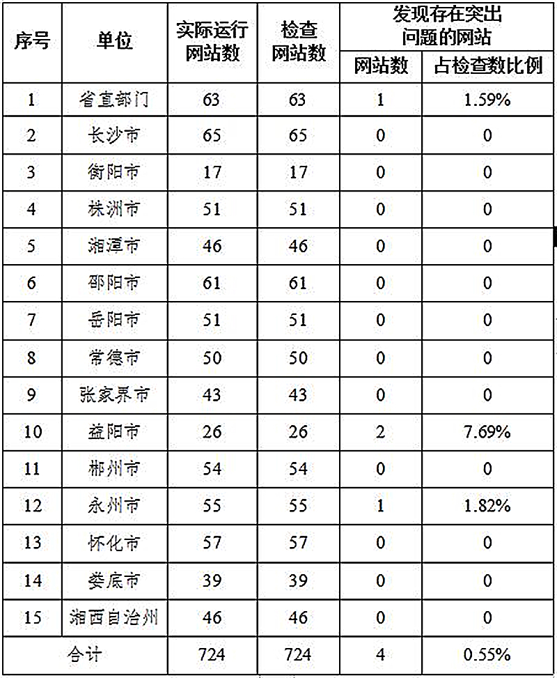 2019年1月1日至2月26日,省政务局组织有关单位对全省处于正常运行状态的724家政府网站(含互联网政务服务平台)进行了检查,检查内容主要包括政府网站信息更新情况、内容准确性、服务实用性、互动回应情况等,本次检查总体合格率为99.45%。长沙市、衡阳市、株洲市、湘潭市、邵阳市、岳阳市、常德市、张家界市、郴州市、怀化市、娄底市、湘西自治州等12个市州政府网站检查合格率达100%。2019年1月至2月,共收到网民通过“我为政府网站找错”平台反映我省政府网站问题的留言共176条,有关网站主管部门和工作机构进行了核实、处理和反馈,其中175条按期办结,1条超期办结,按期办结率99.43%。