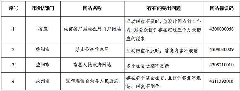 (一)信息更新不及时,发布内容不准确。江华瑶族自治县人民政府网站存在多个空白栏目,湖南省国资网、湘西自治州国资委网站信息更新不及时;益阳市公共资源交易中心、永州市卫生计生委和湘西自治州安监局等单位网站存在错别字。
