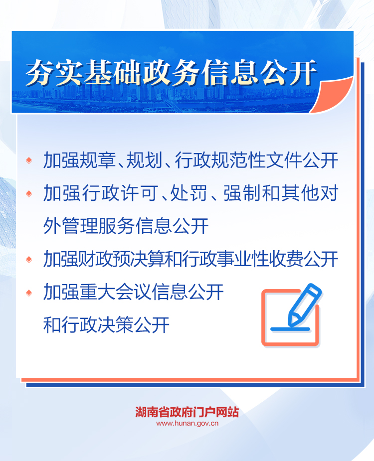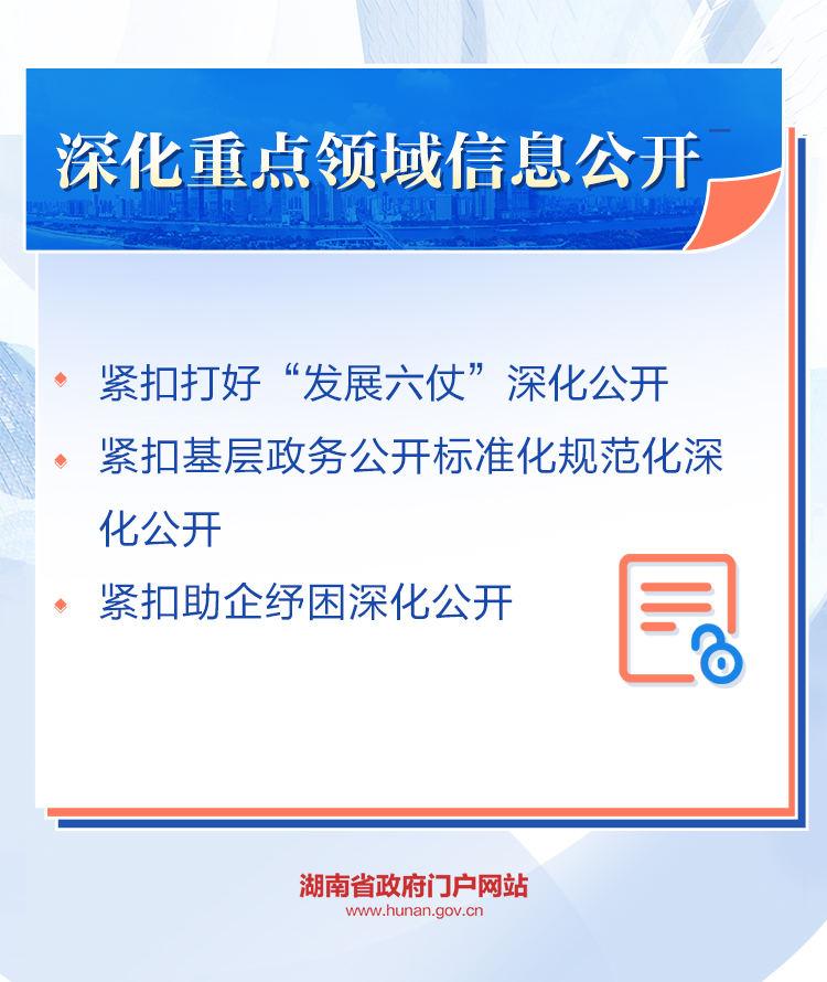 近日,省政府办公厅印发了《湖南省2023年政务公开工作要点》,文件提出紧紧围绕打好“发展六仗”,充分发挥以公开促落实、强监管、优服务的职能作用。