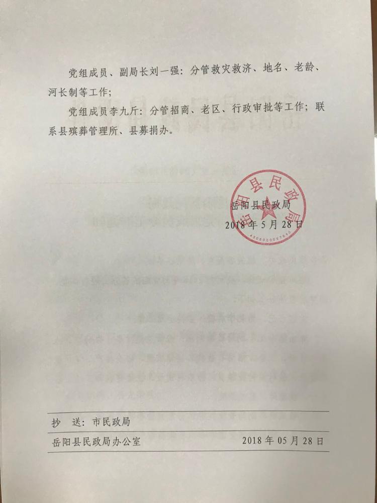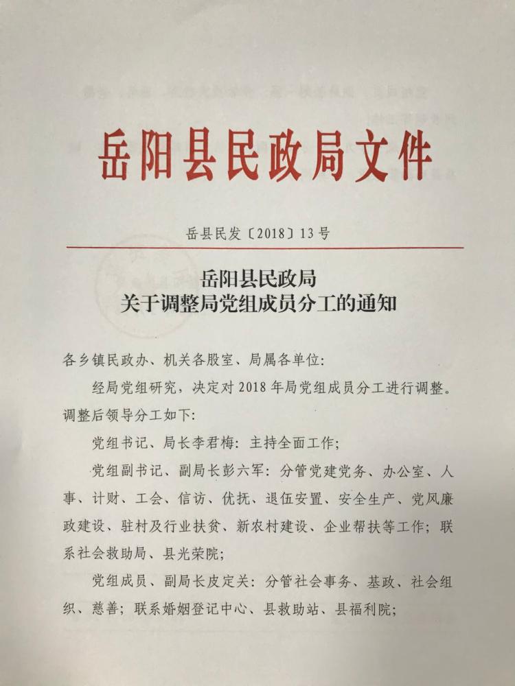 岳阳县民政局关于调整局领导班子成员分工的通知