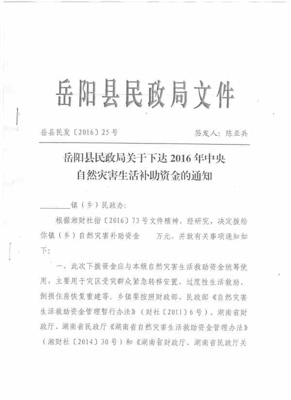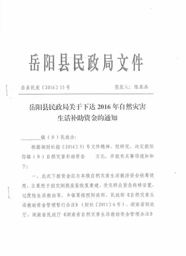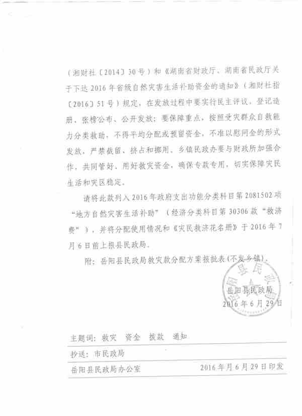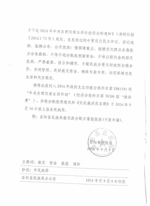 根据财社[2011]6号财政部和民政部制定《自然灾害生活救助资金管理暂行办法》,中央和地方财政安排的自然灾害生活补助资金,主要用于解决遭受自然灾害地区的农村居民无力克服的衣、食、住、医药临时困难,紧急转移安置和抢救受灾群众,抚慰因灾遇难人员家属,恢复重建倒损住房,以及采购、管理、储运救灾物资等支出。截止2016-8-3止,共收到上级下达救灾资金240万元,分别为湘财社指[2016]51号40万,[2016]73号200万,根据救灾资金管理办法要求我局已将救灾资金下拨各乡镇,分别为岳县民发[2016]15号40万,岳县民发[2016]25号200万,详见图表扫描件。