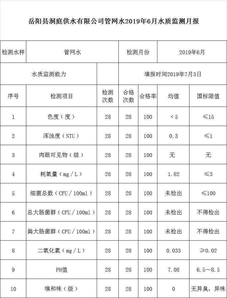 岳阳县洞庭供水有限公司管网水2019年6月水质监测月报