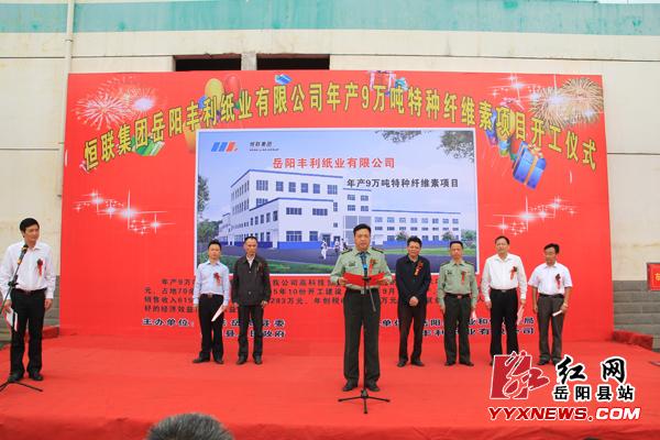 红网岳阳县站10-13讯(分站记者 谌良柱)10-13,恒联集团岳阳丰利纸业有限公司-产9万吨特种纤维素项目开工仪式隆重举行。市委常委、军分区政委张作坤,县领导毛知兵、张中于、余泽世、刘行文、王卫兵,丰利纸业有限公司董事长马修国等出席开工仪式。