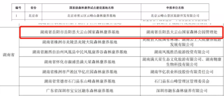 2021年12月3日中国林业产业联合会进行了2021年国家级森林康养试点建设单位认定结果公示公告,湖南省岳阳市岳阳县大云山国家森林公园获评2021年国家级森林康养试点建设基地,这意味着大云山国家森林公园的森林资源质量本底好,交通便利、具有较好的经营能力和康养条件。