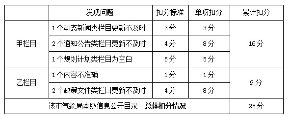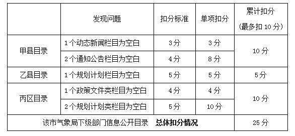 (二)下级部门政府信息公开目录 下级部门政府信息公开目录仅需关注空白栏目和链接可用性问题,按问题发现个数累计扣分,每单位最多扣10分,全部下级部门政府总体扣分不设上限。 例如:某市气象局政府门户网站上,有3个区县气象局信息公开目录存在问题,具体问题类型、数量和扣分计算过程如下。该市气象局下级部门信息公开目录总体扣25分。