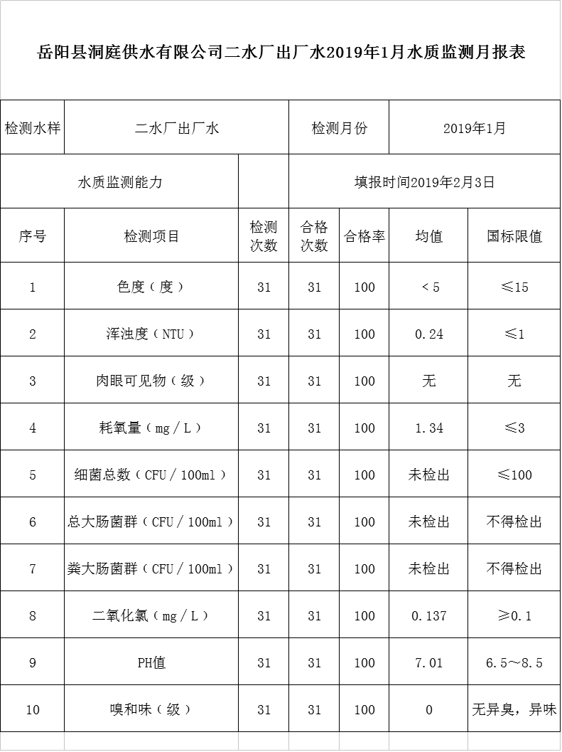 岳阳县洞庭供水有限公司二水厂出厂水2019年1月水质监测月报表