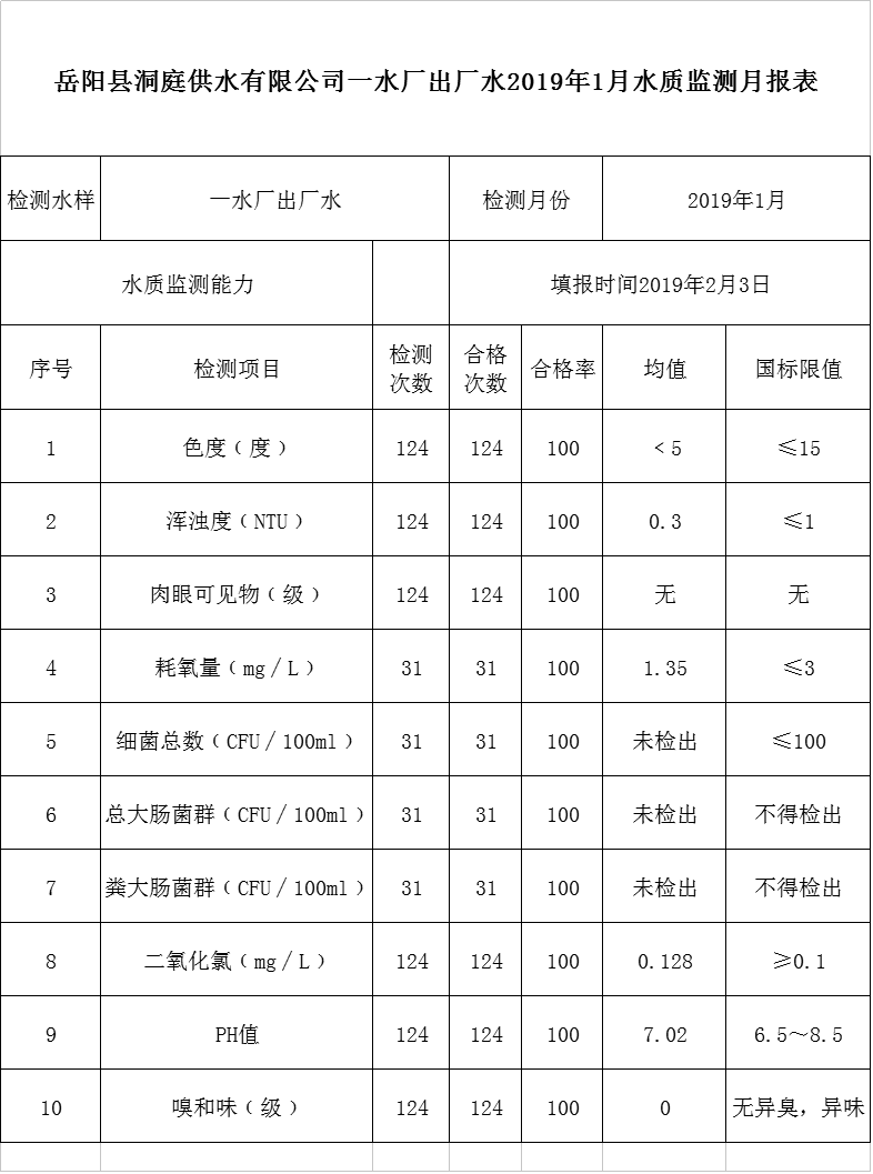 岳阳县洞庭供水有限公司一水厂出厂水2019年1月水质监测月报表
