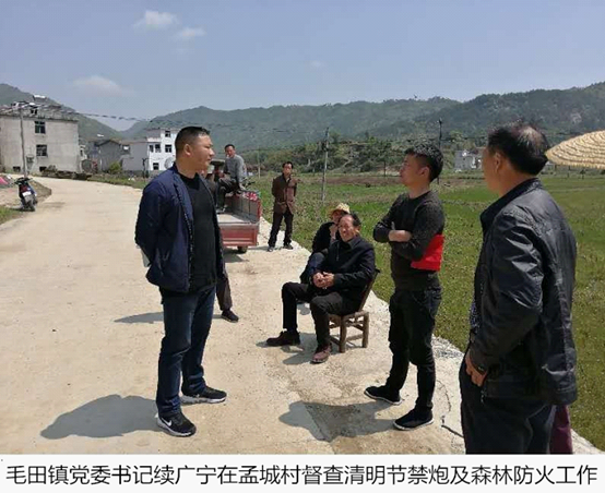周密部署,全面落实责任。4日,召开联村干部和村党(总)支书记会专题部署清明小长假森林防火工作,明确联村干部包村、村干部包片、党员组长包山头的责任制,将责任落实到山头、地块、人头,并要求清明期间,镇村所有森林防火责任人必须坚守岗位,将各项森林防火措施落到实处,确保毛田镇在清明节期间不发生一起火警火灾。同时,清明期间,镇纪委牵头成立了督查组,对镇村防火责任人每天到岗情况及各村措施落实情况进行督查,强化了森林防火责任落实。