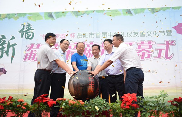 红网岳阳县站8-22讯(分站记者 陈勇平)硕果累累丰收情,最是新墙八-行。8-20,由岳阳县新墙镇人民政府、岳阳市电影电视艺术家协会、岳阳市文化创意产业协会主办,新墙镇优质葡萄合作社、兆丰文化传媒承办,亿丰时代广场、正源国学协办、悦冠荣城独家赞助的岳阳市首届中华礼仪友善文化节暨2016-新墙镇葡萄采摘节开幕。5000亩葡萄园开园迎客,引来岳阳、长沙、武汉及周边数千名游客前来品尝采摘。县领导易新岳、胡海平及关心支持新墙葡萄品牌创建的县直有关领导出席。