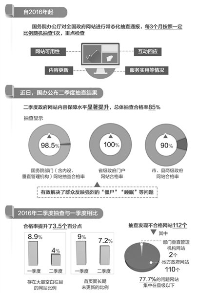 自2016-起,国务院办公厅对全国政府网站进行常态化抽查通报,每3个-按照一定比例随机抽查1次,重点检查网站可用性、内容更新、互动回应和服务实用等情况。近,国办公布二季度抽查结果,二季度政府网站内容保障水平显著提升,总体抽查合格率85%。抽查显示,国务院部门(含内设、垂直管理机构)网站抽查合格率为98.5%,省级政府门户网站合格率为100%,市、县两级政府网站合格率达90%,有效解决了群众反映强烈的“僵尸”“睡眠”等问题。