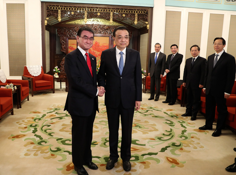 4月15日上午,李克强总理在中南海紫光阁会见出席第五次中日经济高层对话的日本外相河野太郎以及部分日本政府内阁成员。这一高层对话在去年4月重启之前,一度中断了8年。