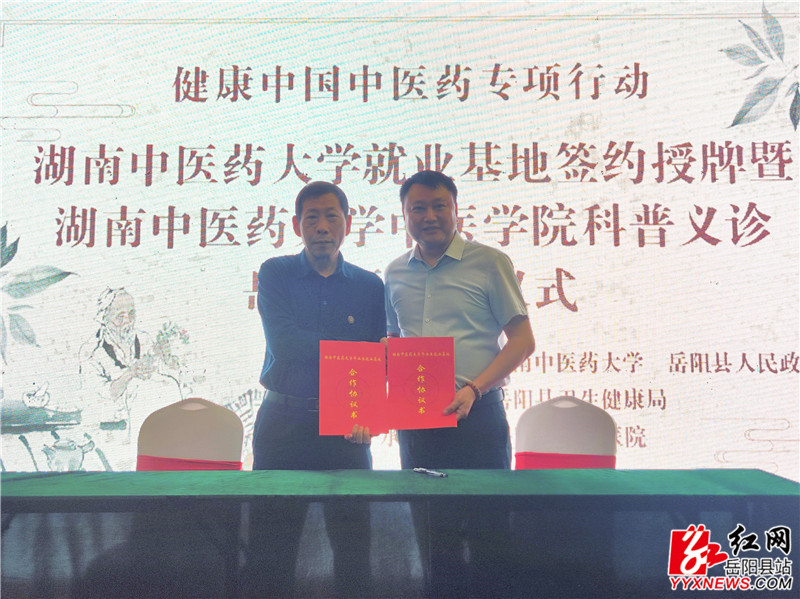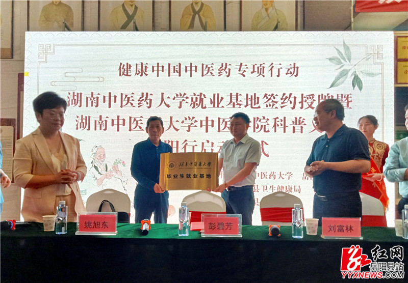 岳阳县融媒体中心5月16日讯(记者 周昱君 实习记者 龙佳敏)5月16日,县中医院与湖南中医药大学就“湖南中医药大学毕业生就业基地”合作签订协议并举行授牌仪式,县人大常委会副主任彭碧芳出席并致辞。