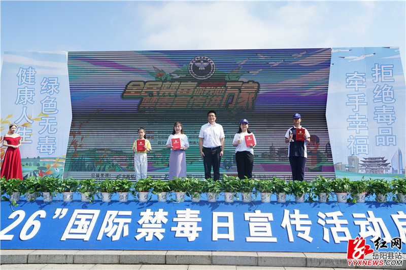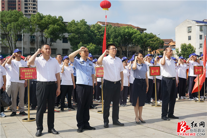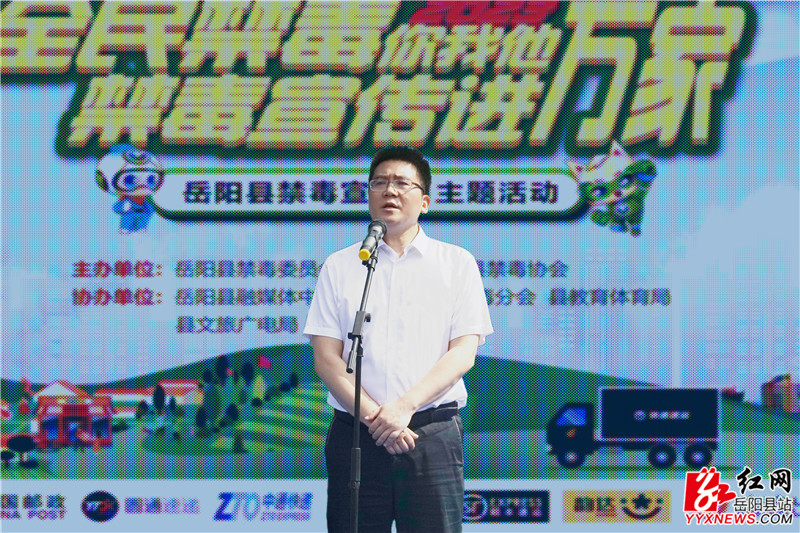 岳阳县融媒体中心6月26日讯(记者 熊佳 周星亮 钟斯洋)6月26日是第36个国际禁毒日,当天我县举行“全民禁毒你我他、禁毒宣传进万家”主题宣传月启动仪式。县委书记肖湘晖出席并宣布活动正式启动。县委副书记、政法委书记、县禁毒委员会常务副主任宋华,副县长、县公安局局长、县禁毒委员会副主任陈遇春,县禁毒协会会长、原县人大常委会副主任龙生光及县禁毒委成员单位、各乡镇(办事处)相关负责人,县禁毒办、县禁毒大队、县禁毒协会和群众代表、学生代表共500余人参加。