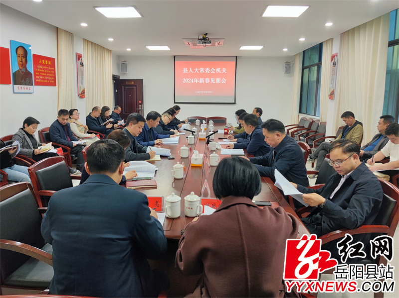 岳阳县融媒体中心2月19日讯(记者 周昱君)2月19日,县人大常委会机关召开2024年“新春第一会”,县人大常委会主任、党组书记周峰出席并讲话。会议由县人大常委会副主任、党组副书记王卫兵主持,副主任彭碧芳、胡秉阳、吴承棉、任三星参加会议。