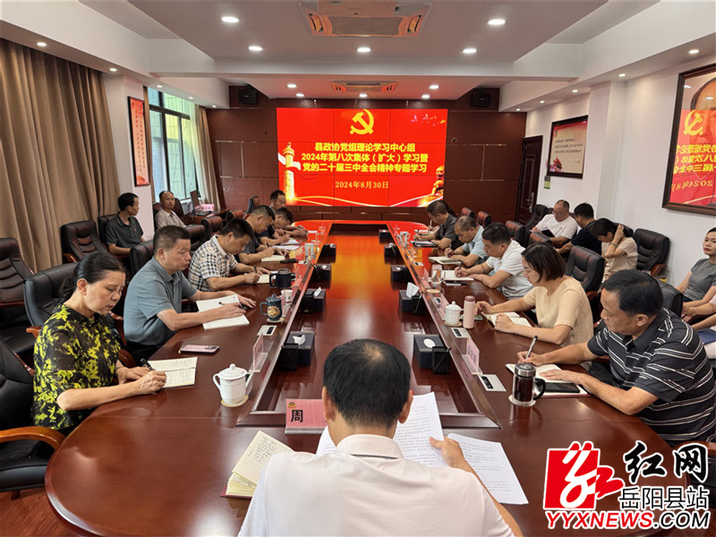 岳阳县融媒体中心8月30日讯(记者 尹宇豪)8月30日,县政协党组理论学习中心组开展2024 年第八次集体(扩大)学习暨党的二十届三中全会精神专题学习和县政协机关“书香政协”第三次集中学习活动。县政协党组书记、主席周里主持,县政协副主席彭荣欣、张忠新、王敏、敖珊出席。