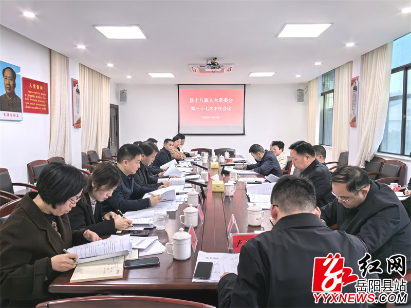 岳阳县融媒体中心2月26日讯(记者 张帆)2月26日,县人大常委会党组书记、主任周峰主持召开县十八届人大常委会第三十七次主任(扩大)会议,党组副书记、副主任王卫兵,副主任彭碧芳、胡秉阳、吴承棉、任三星参加。