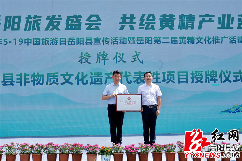 岳阳县融媒体中心5月9日讯(周星亮 黄阳娇)5月9日,5·19 中国旅游日岳阳县宣传活动暨岳阳第二届黄精文化推广活动在杨林小镇黄精文创基地举行。县委常委、宣传部部长张哲君为岳阳县非物质文化遗产代表性项目授牌,副县长续广宁发表致辞,县人大常委会副主任任三星,县政协副主席张忠新,县政协副主席、县商粮局局长敖珊参加。