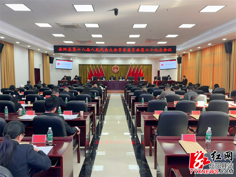 岳阳县融媒体中心11月27日讯(周昱君)11月26日,县十八届人大常委会第二十九次会议召开。县人大常委会党组书记、主任周峰,党组副书记、副主任王卫兵,副主任彭碧芳、胡秉阳、吴承棉、任三星出席。县领导邓旭旺、贺立、胡海平、李樱、刘斌清,县人民法院院长古田,县人民检察院检察长闵孚君列席会议。会议由县人大常委会副主任任三星主持。