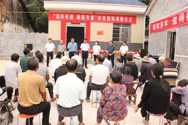 为倡导社会守望相助、扶残助残文明新风尚,精准帮助残疾人扶贫解困,中国人寿保险股份有限公司湖南分公司(以下简称“国寿保险湖南分公司”)向省残联“连千村帮万户扶贫工程”联系点——岳阳县荣家湾镇鹿角村开展捐赠活动。本次捐赠活动共筹集物资8万元,国寿保险湖南分公司捐赠5万元,湖南省残疾人福利基金会岳阳分会捐赠3万元。活动共为36户残疾人家庭及建档立卡贫困户家庭送上现金及电视机、被褥等慰问物资。