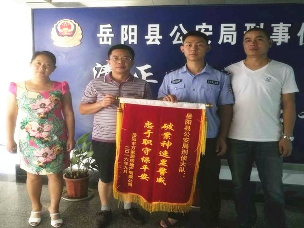 9-18, 岳阳县福来登五星级酒店项目负责人一行手捧一面“破案神速显警威,忠于职守保平安”的锦旗走进刑侦大队,万分感激地向刑侦民警献旗致敬,由衷赞扬刑侦民警:你们不怕疲劳,奋勇破案保安全,真是我们群众的守护神。