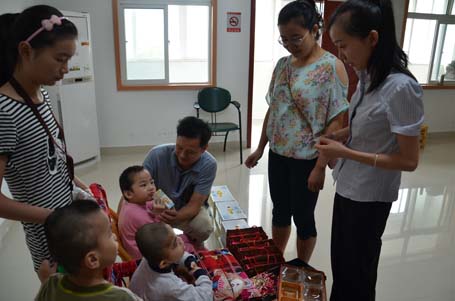 福利院里,636志愿者仔细询问和了解了每一位孤残儿童的身体状况以及疾病康复、生活照顾等情况,并把-饼、儿童牛奶等慰问物资分发到他们手中。当前,岳阳县社会福利院有孤残儿童13个,大部分儿童-龄1-7岁,智力发育滞后严重,基本靠保育员帮助进食。见此情景,志愿者们用微笑与孩子们交流,和他们一一拉拉小手,用手中的温暖传递给他们坚强生活的信心。这些孩子虽然都无法说话,但从他们脸上和眼中可以看到开心和幸福,无不让每一位志愿者动容。