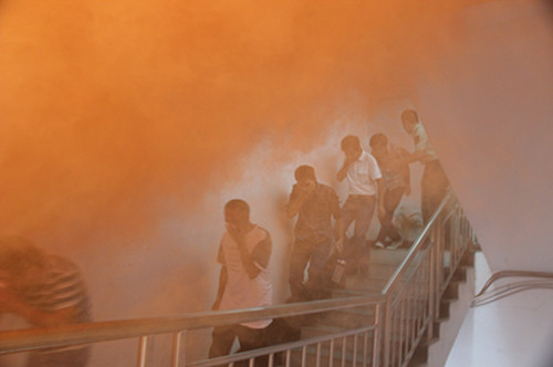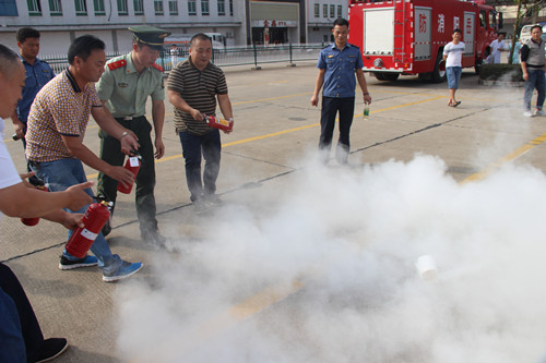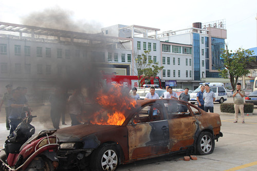 演练过程针对一辆正在行驶的小车与摩托车相撞,小车突然起火,中队官兵当场演示了火灾初期正确的灭火救援处置方法。随后,中队工作人员召集车站司机,部分乘客及工作人员,开展了火灾初期正确的灭火逃生方式;并现场手把手教导大家灭火器的正确使用方法。