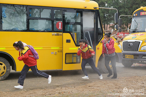 所有学生立即解开安全带,弯腰降低身体重心并使用衣袖、红领巾保护口鼻,迅速从前门和安全门撤离。